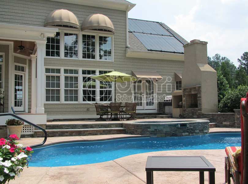 Pool heating solar collector are installed on roof in a sunny position. Pool water is pumped through hundreds of tubes in the collectors where it absorbs the solar energy. This heated water is then returned to the pool for your enjoyment.